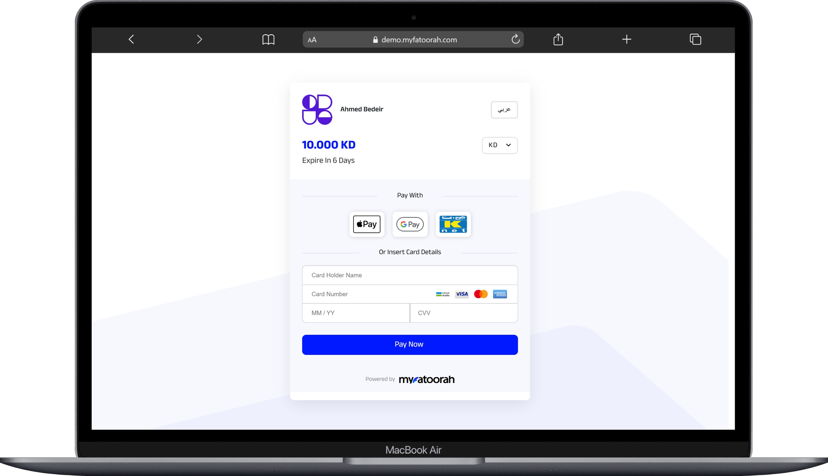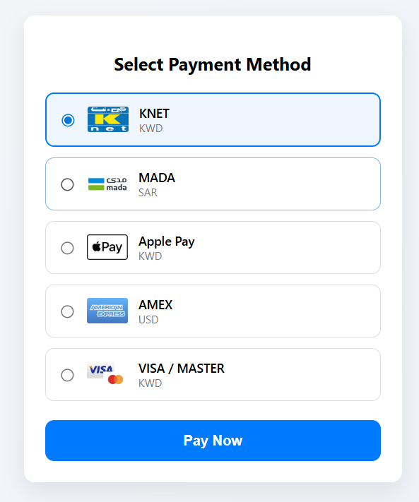 AvailabilityBased on your account and agreement with MyFatoorah, not all payment methods will be available for your account. If a specific payment method is needed, please, contact your account manager.