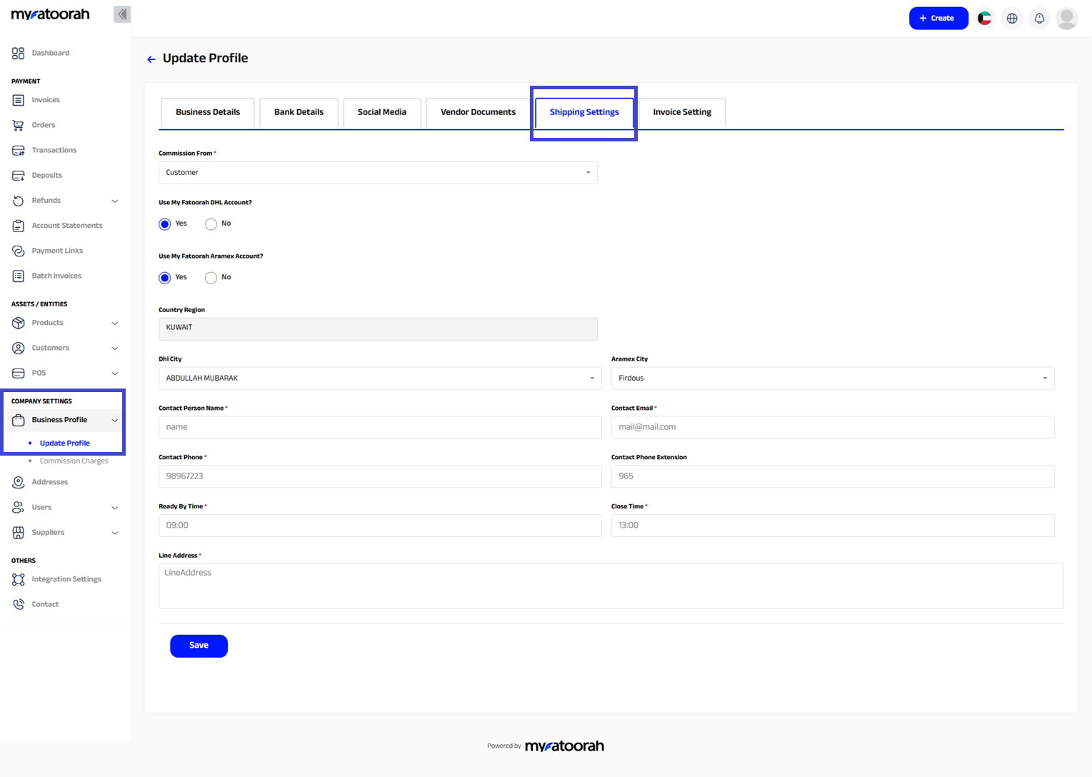 - Click on the Shipping Settings tab and fill in the form.