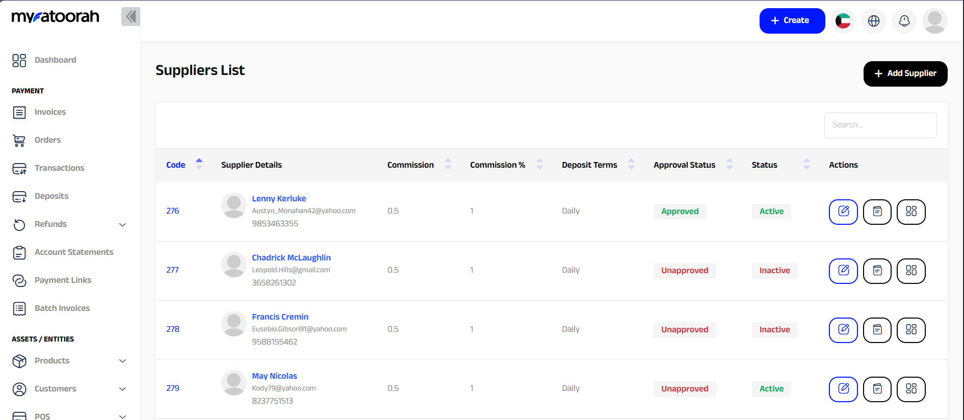 From your admin account on the MyFatoorah portal, you can easily add, edit, and delete suppliers under your account. Once you create a supplier, you will be able to manage all related data as follows: